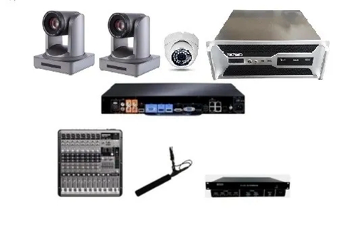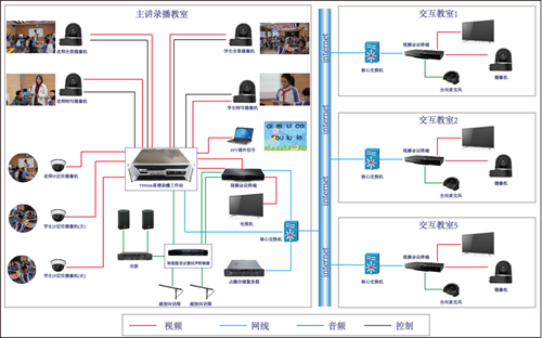 多點互動錄播系統(tǒng)具有功能強大,操作簡單,可實現(xiàn)全程無人值守等特點。該系統(tǒng)可支持 1 間全自動錄播教室,與 5 間遠程互動教室協(xié)同工作,進行實時視頻交流與錄播教室的課程錄制,系統(tǒng)由 4 臺高清攝像機(2 臺特寫攝像機 2 臺全景攝像機),4-8 組強指向采訪話筒及調(diào)音臺,1 臺錄播工作站,1 臺串口服務(wù)器及 3 臺圖像定位攝像機,以及視頻會議終端與電視機組成。該系統(tǒng)能夠滿足校內(nèi)常態(tài)課、精品課、微課以及互動課程的錄制工作。