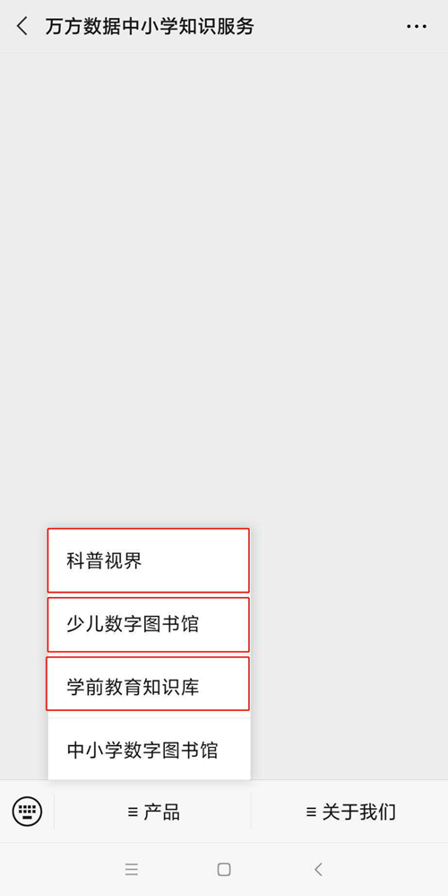 在“萬方數(shù)據(jù)中小學(xué)知識(shí)服務(wù)”界面,點(diǎn)擊左下角“產(chǎn)品”,可以顯示出我們免費(fèi)提供的三款產(chǎn)品入口(如上圖)