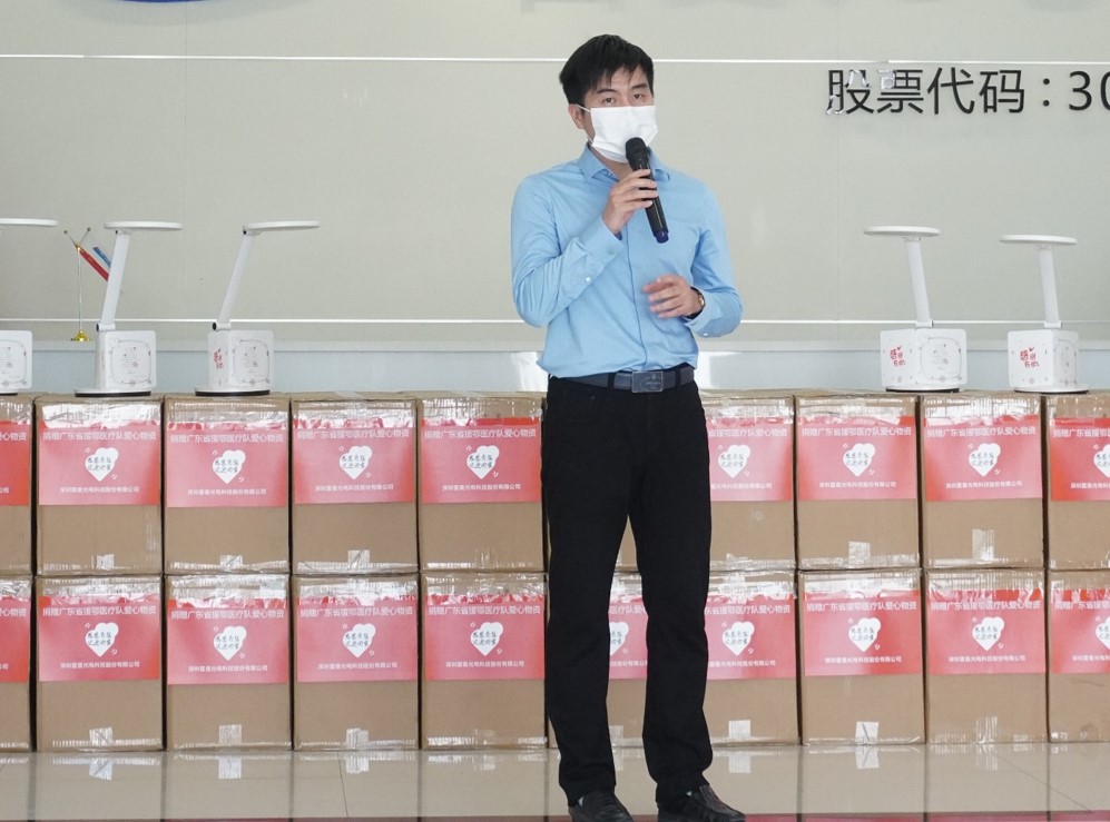 最后,照明協會秘書長趙飛代表廣東省援鄂醫護人員上臺接受捐贈。趙秘書長在致敬抗疫英雄的同時,也對拓享科技熱心公益、主動承擔社會責任的行為,表示肯定與贊許。并表示,協會將進一步加強與工商聯、拓享科技的聯系,攜手抗疫,共創美好明天!至此,本次捐贈儀式正式落下帷幕。