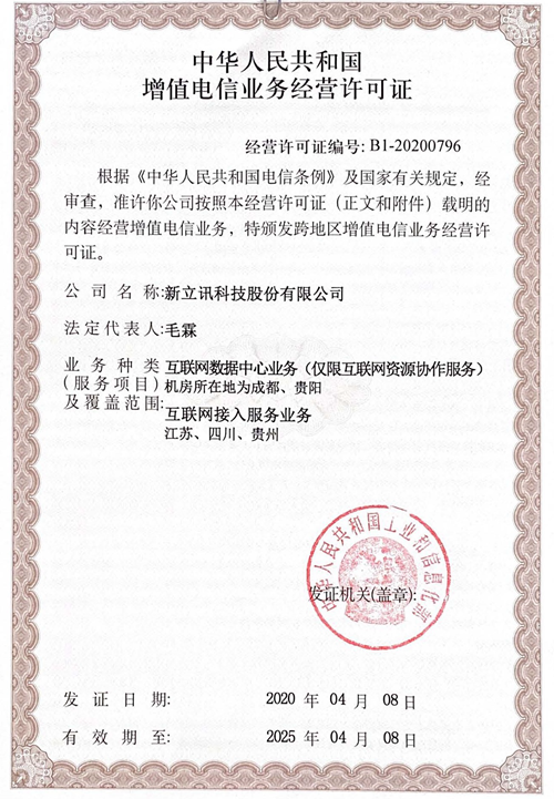 新立訊公司現已累計獲得:互聯網信息服務業務、互聯網接入服務(ISP)業務、互聯網數據中心業務(IDC)增值電信牌照。實現較為完善互聯網數據中心布局,本次取得新的業務經營許可證是相關行業監管部門對新立訊近年來業務經營能力及成果的充分肯定,也是新立訊業務擴張策略和企業轉型布局的重要體現,是新立訊又一重要里程碑時刻。今后,新立訊將繼續秉承“服務社會、創造價值”的企業使命,積極創新,不斷為客戶提供更專業、穩健、高效的綜合數據業務,服務國家戰略“新基建”建設。