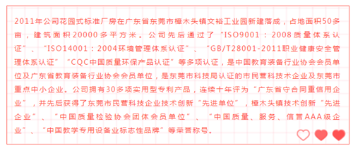 東莞市新科教學設備有限公司 成立于1998年,是一家專業從事現代學科實驗室設備規劃、設計、研發、制造、安裝以及售后服務于一體的高新技術企業。公司成立二十多年以來,一直致力于學科實驗室裝備事業的研發與制造,主要服務于教育系統與企業單位,涵蓋中小學基礎教育、高等教育及職業技術教育領域,同時也廣泛應用于科研、檢測、化工、醫療等其它行業。