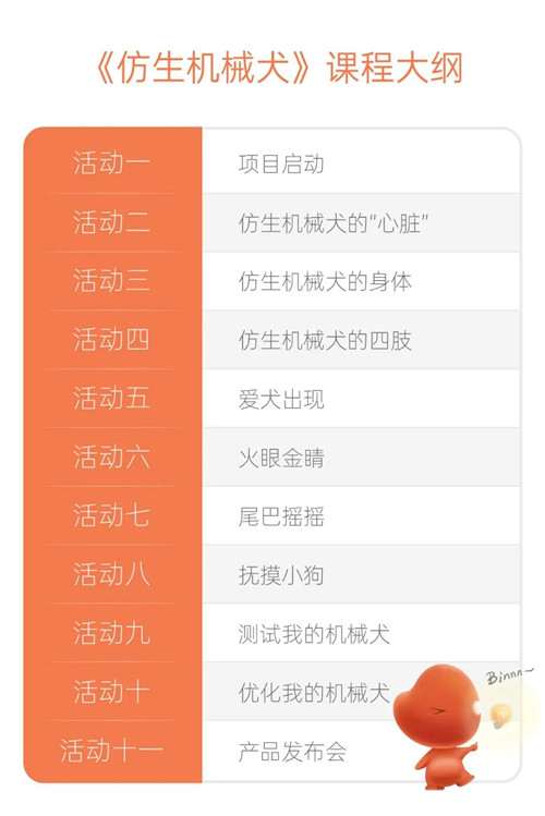 《仿生機械犬》因此而生。本課程引導學生了解狗狗的行走特點以及行為特征,設計并搭建一款能像寵物狗一樣的仿生機械犬。通過編程實現仿生機械犬的行走、搖尾、追人等功能。