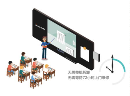 UCN納米智能黑板首創了E-box插拔設計,將易損部件全部集中到一個小盒子里,出現故障時,可在30分鐘內解決,不耽誤教學進度。