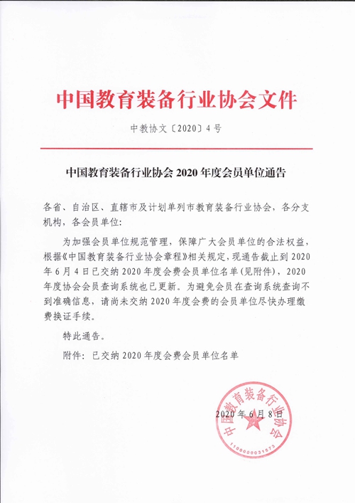 為加強會員單位規范管理,保障廣大會員單位的合法權益,根據《中國教育裝備行業協會章程》相關規定,現通告截止到2020年6月4日已交納2020年度會費會員單位名單(見附件),2020年度協會會員查詢系統也已更新。為避免會員在查詢系統查詢不到準確信息,請尚未交納2020年度會費的會員單位盡快辦理繳費換證手續。