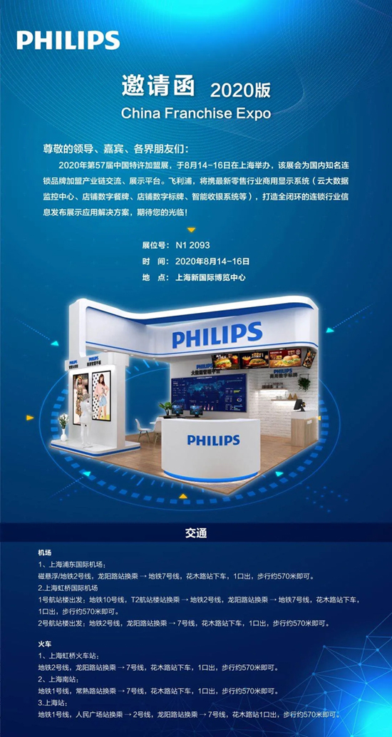 千億級市場蘊藏的巨大商機,吸引著各路資本追逐。飛利浦商用顯示器一直堅持科技創(chuàng)新,秉承“創(chuàng)新為你”的品牌理念,憑借行業(yè)領先的創(chuàng)新科技,長期以來一直以實力引領市場。在本次特許加盟展上,飛利浦將攜最新零售行業(yè)商用顯示系統(云大數據監(jiān)控中心、店鋪數字餐牌、店鋪數字標牌、智能收銀系統等),打造全閉環(huán)的連鎖行業(yè)信息發(fā)布展示應用解決方案,敬請光臨!