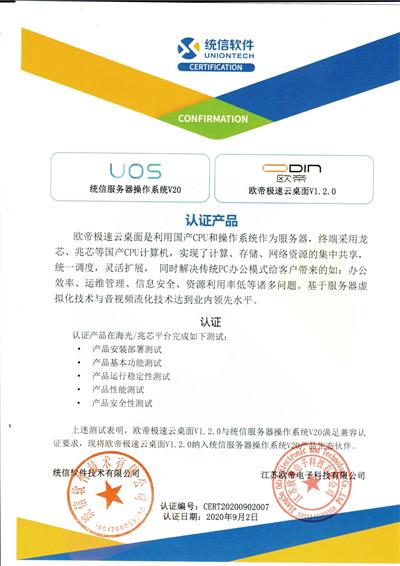 測試結(jié)果表明,雙方滿足兼容認(rèn)證要求,兼容性良好,產(chǎn)品功能正常,性能卓越,系統(tǒng)運行穩(wěn)定,歐帝極速云桌面V1.2.0納入統(tǒng)信服務(wù)器操作系統(tǒng)V20產(chǎn)品生態(tài)伙伴。