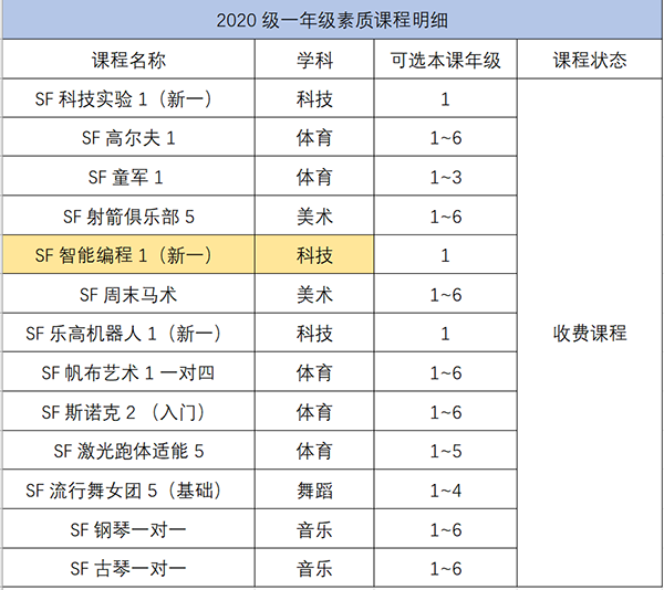 針對(duì)小學(xué)一年級(jí)新生,北京王府學(xué)校開設(shè)以“一體兩翼,多元發(fā)展”為培養(yǎng)目標(biāo)的素質(zhì)課,涵蓋科技、美術(shù)、體育、舞蹈、音樂(lè)等學(xué)科,共約 50 門課程供學(xué)生自由報(bào)讀。
