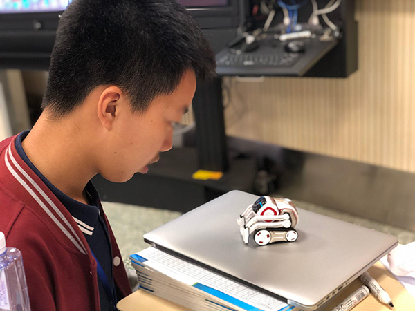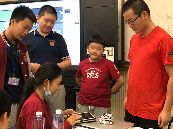 面向初中部學(xué)生,「智能編程」課使用更高級(jí)別的智能編程機(jī)器人作教具,通過(guò)親自動(dòng)手控制機(jī)器人進(jìn)行有趣互動(dòng),學(xué)生得以學(xué)習(xí)其視覺識(shí)別、地標(biāo)導(dǎo)航、語(yǔ)音生成等人工智能技術(shù),逐漸建立起對(duì)人工智能概念的理解。