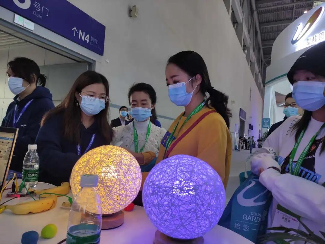 引起觀展者好奇的項目還有水果鍵盤:接入 Makey Makey,基于電傳導原理,當人體觸碰香蕉時形成回路,點亮智能燈球。