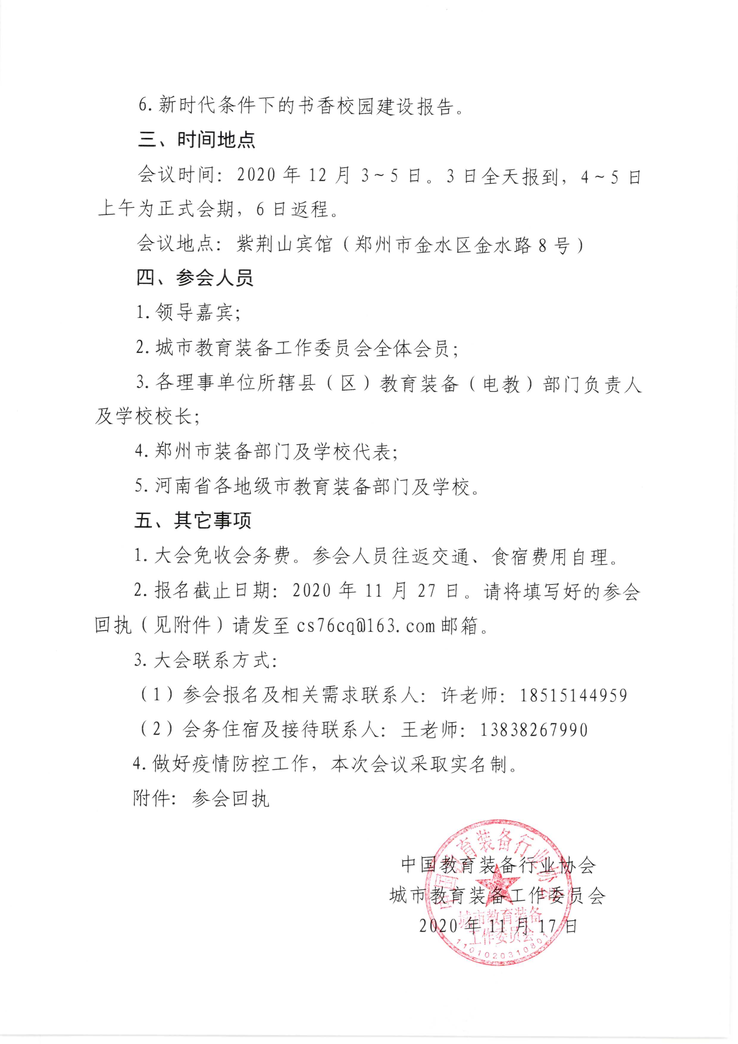 中國教育裝備行業(yè)協(xié)會城市教育裝備工作委員會定于2020年12月3~5日在鄭州召開2020城市教育裝備工作委員會年會暨新技術(shù)推進實驗教學應用與建設書香校園報告會,現(xiàn)將有關(guān)事項通知如下: