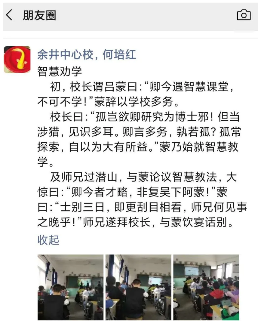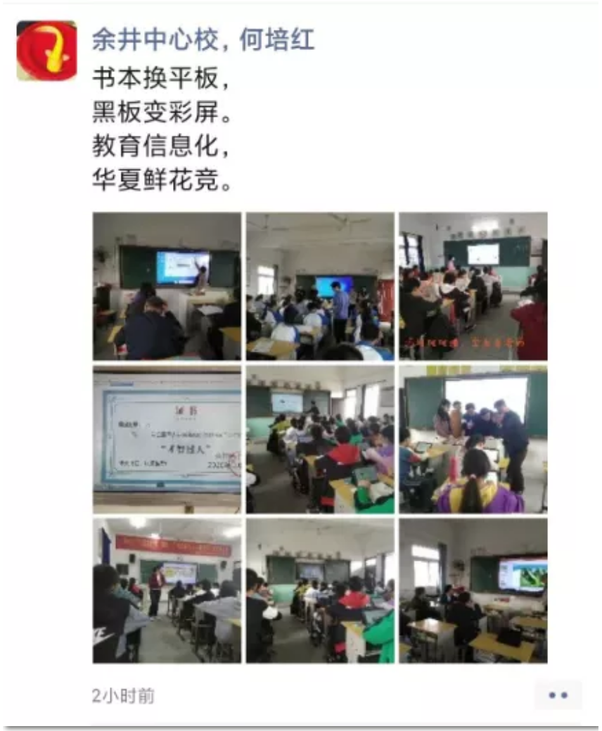 驗收前期,我們也收到了坐落于皖水之畔的余井中心校何培紅老師的即興小詩:“書本換平板,黑板變彩屏。教育信息化,華夏鮮花競。”