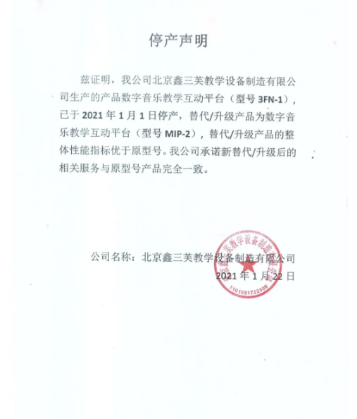 茲證明,我公司北京鑫三芙教學(xué)設(shè)備制造有限公司生產(chǎn)的產(chǎn)品數(shù)字音樂(lè)教學(xué)互動(dòng)平臺(tái)(型號(hào)3FN-1),已于2021年1月1日停產(chǎn),替代/升級(jí)產(chǎn)品為數(shù)字音樂(lè)教學(xué)互動(dòng)平臺(tái)(型號(hào)MIP-2), 替代/升級(jí)產(chǎn)品的整體性能指標(biāo)優(yōu)于原型號(hào)。我公司承諾新替代/升級(jí)后的相關(guān)服務(wù)與原型號(hào)產(chǎn)品完全一致。