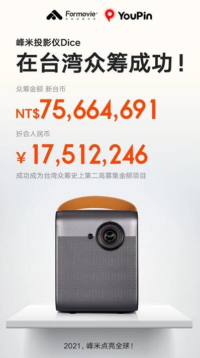 1月26日,光峰科技(688007.SH)旗下子公司峰米科技再獲喜訊,其智能投影儀Dice(以下簡稱“Dice”)在臺灣地區成功完成眾籌,募資金額超過7500萬新臺幣(約1751萬人民幣),參與眾籌人數高達4327人,創下了多個臺灣島內相關的眾籌紀錄,讓峰米獲得了出境戰略的開門紅。