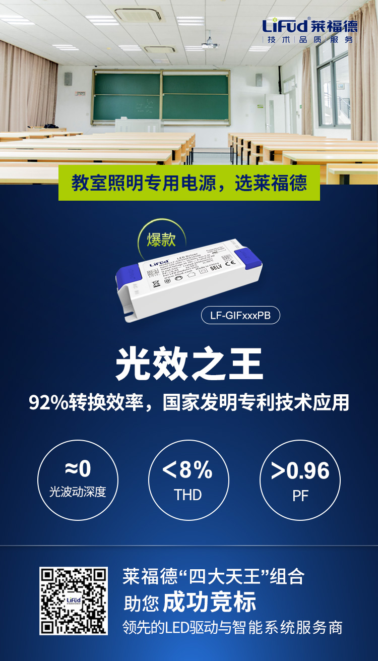 LF-GIFxxxPB作為萊福德專為非智能教室照明改造打造的新品,擁有極高的轉換效率、優異的THD及PF值,是有嚴苛改造要求的教室照明項目首選產品。