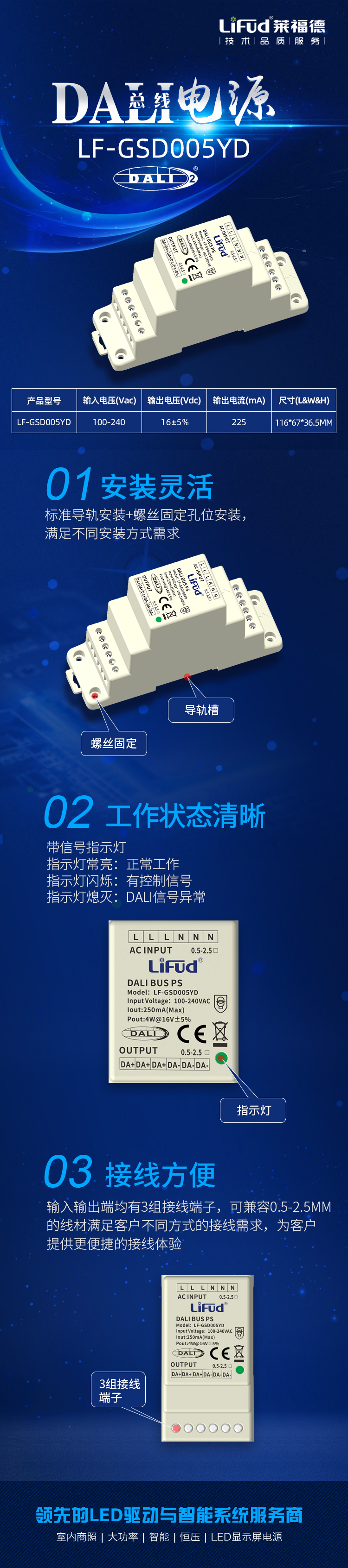 LF-GSDxxxYG是一款DALI恒流調光調色溫產品,功率覆蓋10-50W。該產品同時搭載Push調光,可實現不接入DALI系統也能0.1%~100%平滑調光、調光全程無頻閃、調光精度≤3%等優勢,給到用戶多種選擇,備貨更簡單。