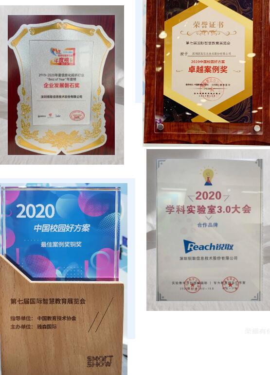 榮譽(yù)閃耀,熠熠生輝。這一年,銳取以強(qiáng)大的品牌實(shí)力和技術(shù)成果滿載勝利,高質(zhì)量產(chǎn)品及優(yōu)良服務(wù)獲得眾多客戶及合作伙伴的認(rèn)可與贊譽(yù)。在第七屆國(guó)際智慧教育展覽會(huì)的校園好方案評(píng)選上,銳取憑借““教考融合·三個(gè)課堂”方案在數(shù)千份參賽方案中脫穎而出,成功斬獲“最佳案例獎(jiǎng)”和“卓越案例獎(jiǎng)”!在一年一屆的信息化視聽(tīng)行業(yè)年度榜“Best of the Year”中,銳取以強(qiáng)大實(shí)力與行業(yè)口碑榮獲“企業(yè)發(fā)展磐石獎(jiǎng)”;在2020學(xué)科實(shí)驗(yàn)室大會(huì)3.0上,銳取作為大會(huì)合作伙伴閃耀亮相大會(huì)現(xiàn)場(chǎng)。2020年,銳取在鼓勵(lì)與肯定中砥礪前行,創(chuàng)造精彩!