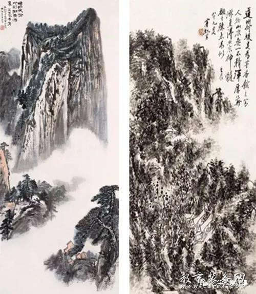 何海霞,尤擅中國水墨畫、青綠山水(左);風(fēng)格渾厚華滋,意境郁勃澹宕,是黃賓虹山水畫的顯著特點(diǎn)。