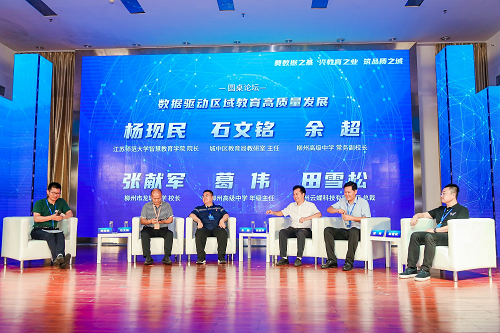 圓桌論壇環節由江蘇師范大學楊現民教授主持,邀請城中區教育局教研室石文銘主任、柳州高級中學余超副校長、城中區龍城中學張獻軍校長、柳州高級中學葛偉博士、廣州云蝶科技有限公司田雪松總裁,共同圍繞“數據驅動區域教育高質量發展”這一主題進行探討。
