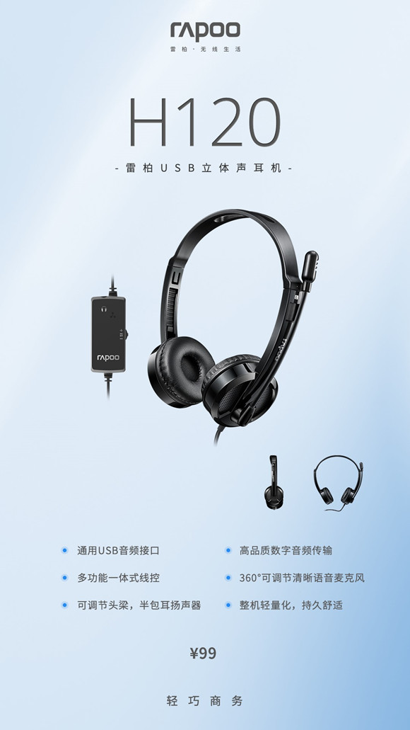 雷柏H120 USB立體聲耳機,擁有高清立體聲發聲單元、標準USB接口、360°可調節麥克風、多功能一體式線控、輕量化設計、十分適合有上網課、話務溝通、視訊聊天需求的用戶使用,現上市誠意價僅99元,感興趣的朋友千萬不要錯過!