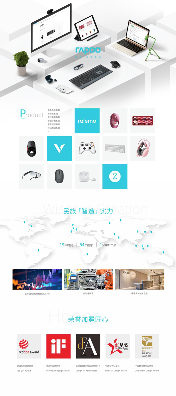 雷柏連年受邀參加德國IFA、美國CES等全球消費電子大展,展現新國貨魅力。屢獲德國IF設計獎、德國Reddot紅點設計大獎、日本G-Mark設計獎、亞洲DFA最具影響力設計獎、中國創新設計紅星獎、中國臺灣金點設計獎等國內外權威設計獎,讓3C硬件重塑新動力與新方向,重構想象。向世人展現新國貨的標桿實力。