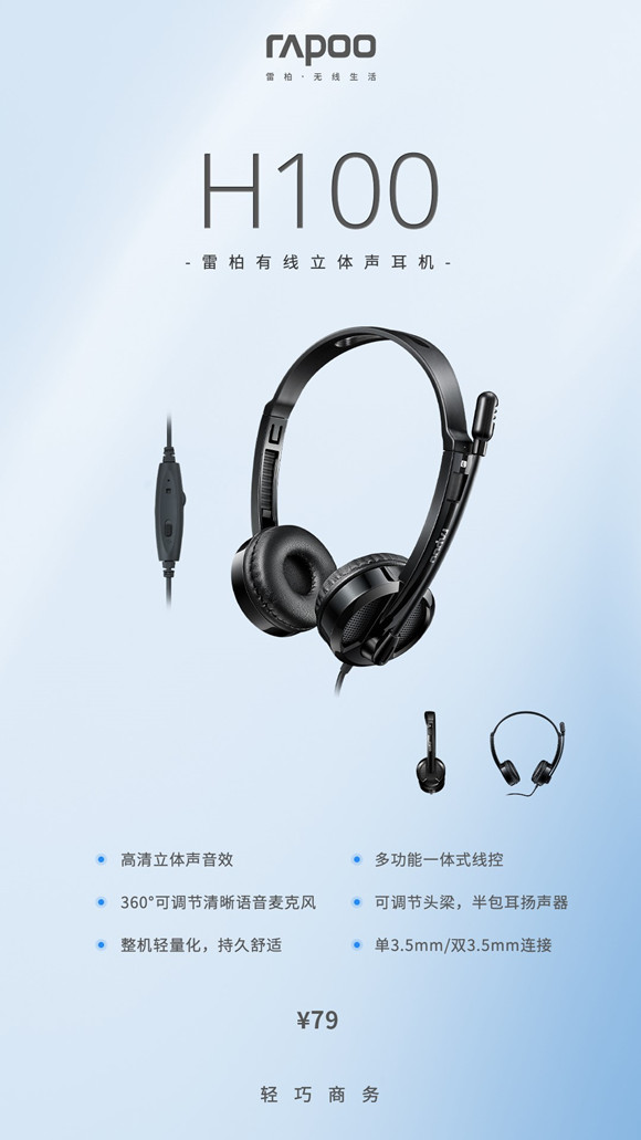 雷柏H100有線立體聲耳機,擁有高清立體聲發聲單元、360°可調節降噪麥克風、多功能一體式線控、輕量化設計、兩種連接方式,十分適合有上網課、話務溝通、視訊聊天需求的用戶使用,現上市誠意價僅79元,感興趣的朋友千萬不要錯過!