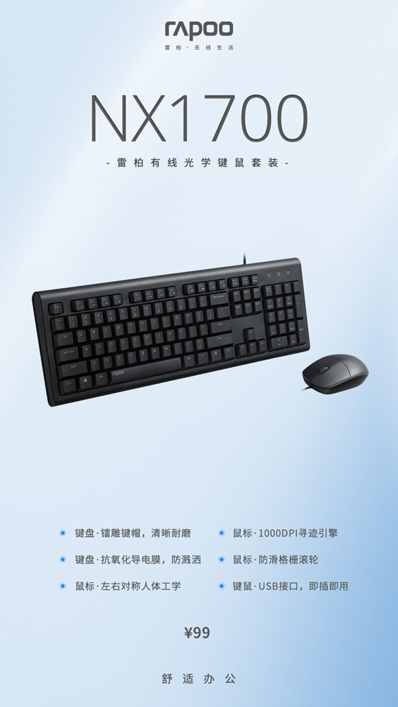 舒適辦公 雷柏NX1700有線光學(xué)鍵鼠套裝上市