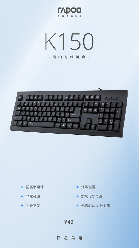 雷柏K150有線鍵盤憑借49元親民的售價和可靠的性能,必將成為入門級辦公鍵盤的代表作,助力廣大白領高效辦公、征戰職場。