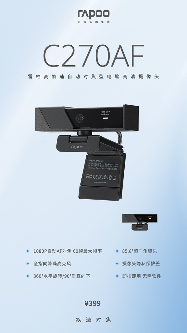 近日,領(lǐng)軍國(guó)產(chǎn)外設(shè)品牌,實(shí)力大廠上市企業(yè)Rapoo雷柏,推出了帶有AF自動(dòng)對(duì)焦型的電腦高清攝像頭——C270AF,AF自動(dòng)對(duì)焦1080P畫(huà)質(zhì)的高清影像,60幀的高幀速動(dòng)態(tài)幀率,85.8°超廣角鏡頭,降噪麥克風(fēng),攝像頭隱私保護(hù)蓋,多角度的旋轉(zhuǎn)鏡頭等,為你開(kāi)啟視頻互動(dòng)的高清流暢直播狂潮。