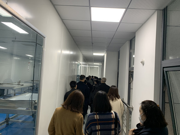 參觀完產品展示廳后,參訪者們來到了生產車間進行參觀。車間使用面積約為710㎡,包含自動化噴涂空間、自動化覆膜空間、自動化裁切粘結空間、自動化貼合空間等區域,按照潔凈空間施工要求施工。自動化車間用最少的人力實現最高的效率,保質保量地進行產品生產與供應。