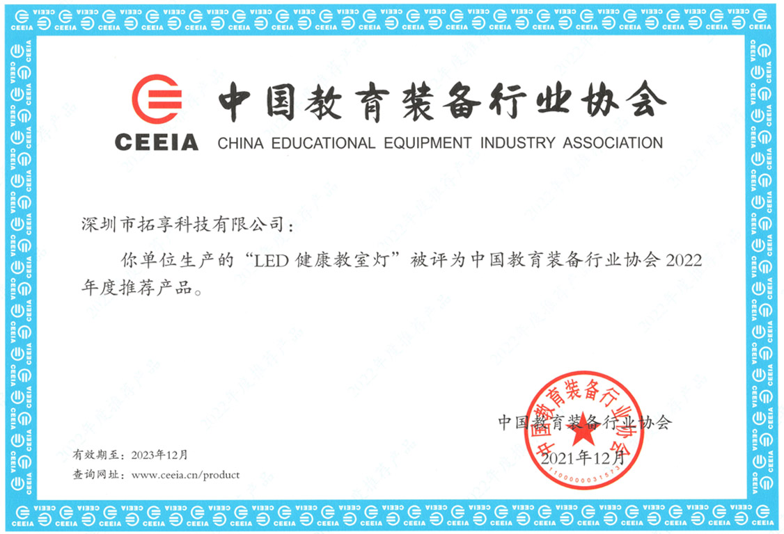 近日,中國教育裝備行業協會公布了一份名單,拓享LED健康教室燈具因品質優異,被列入中國教育裝備行業協會2022年度推薦產品。