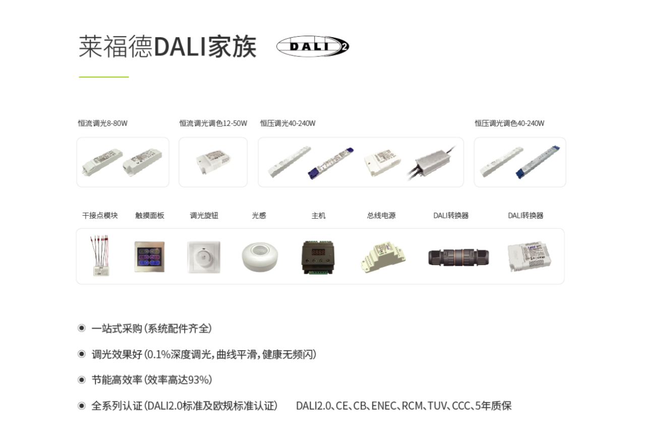 在DALI技術研究上,自2014年萊福德首款DALI產品上市,成為國內最早一批DALI會員開始,萊福德在DALI控制驅動上不斷布局,至今已有近百款各功率型號的DALI產品。