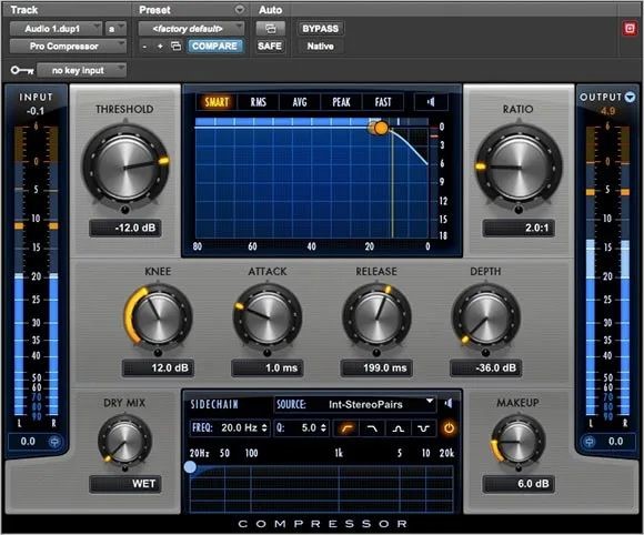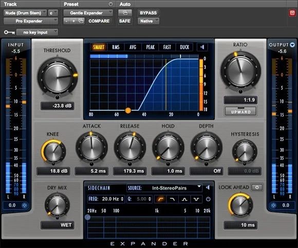 平均檢測器通過計算平均響度來均衡聲音,峰值檢測器根據(jù)設(shè)定的閾值優(yōu)化聲音,快速峰值檢測器使用更快的起音和釋音時間來平滑瞬變重的軌道(如鼓),RMS檢測器使用這種強(qiáng)大的“全方面”增強(qiáng)器/優(yōu)化器來改善軌道 - 智能模式(默認(rèn))快速賦予軌道生命,壓縮軌道而不失真或跳動