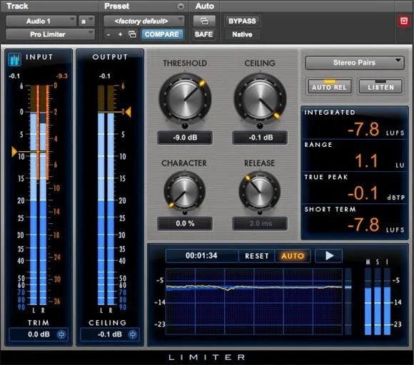 Pro Limiter 符合 ITU-R BS.1770-3 響度電平標(biāo)準(zhǔn),包括Turea Peak、綜合響度和響度范圍測量,適用于 EBU R128 和 ATSC A/85 (CALM Act) 廣播工作流程