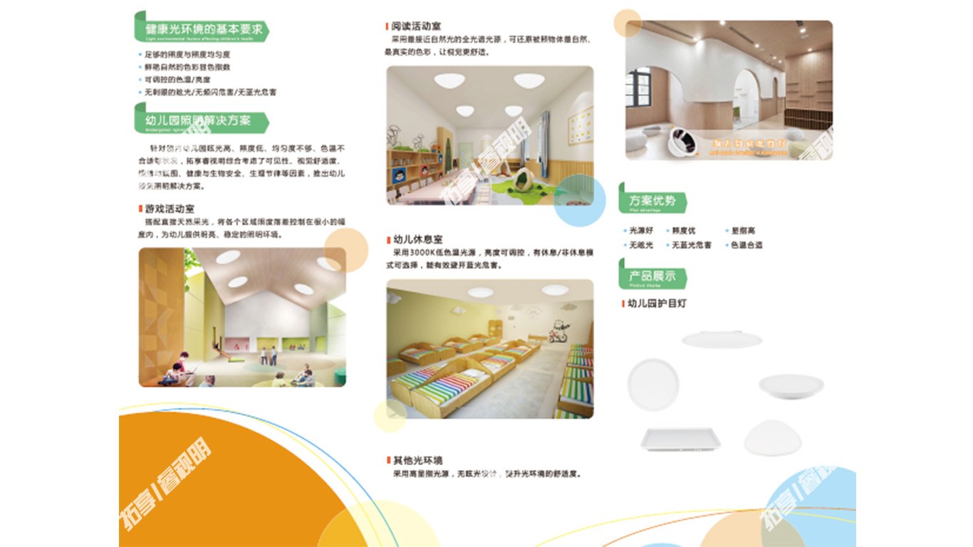 2021年3月,針對國內幼兒園普遍存在的眩光高、照度低、照度均勻度差及色溫不適等光環境問題,拓享睿視明綜合考慮了可見性、視覺舒適度、情緒與氛圍、健康與光生物安全、人體生理節律等因素,推出系列幼兒園健康照明解決方案,包含幼兒游戲活動室、幼兒閱讀活動室、幼兒休息室及其他光環境。