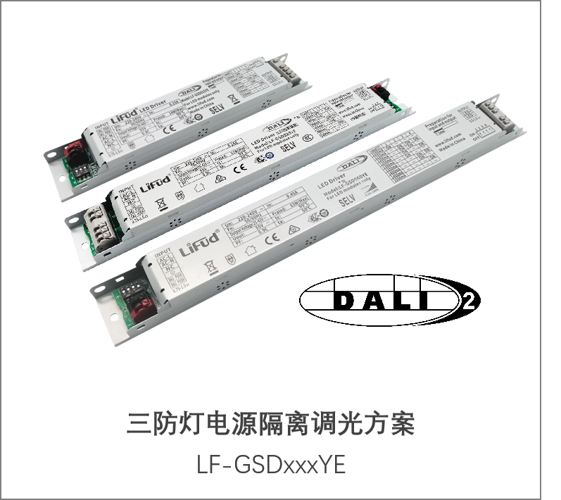 LF-GSDxxxYE隔離DALI&Push調光電源,全系列包含12/20/30/40/60/80YE六個系列型號,功率涵蓋4-80W,是市場上功率系列最齊全的三防燈電源產品之一,其調光深度小于0.1%,且調光全程平滑無頻閃。