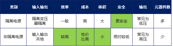 電路設計的不同就帶來了元器件使用、成本、效率、輸出參數等的不同,同類功率應用電源的隔離與非隔離方案主要差異如下表格: