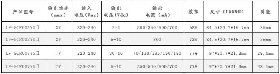 LF-GIRxxxYSII系列主要針對迷你小功率筒燈、射燈、壁燈等燈具應用,功率范圍覆蓋1-7W,參數齊全輸出電流70-700mA可選,助力各珠寶、家居、商業等重點氛圍照明。