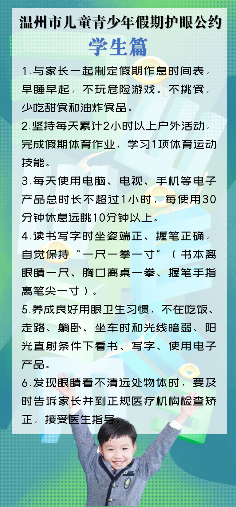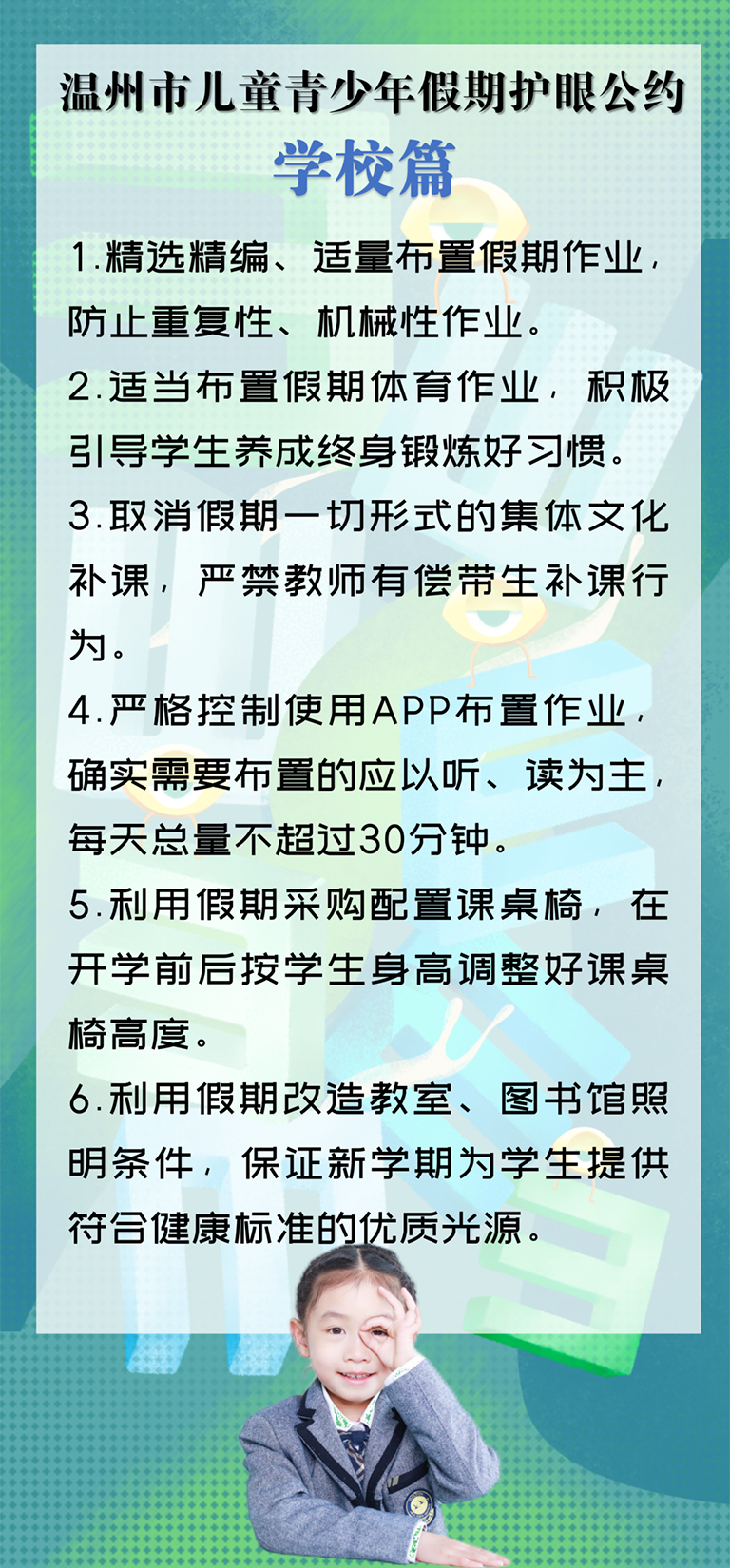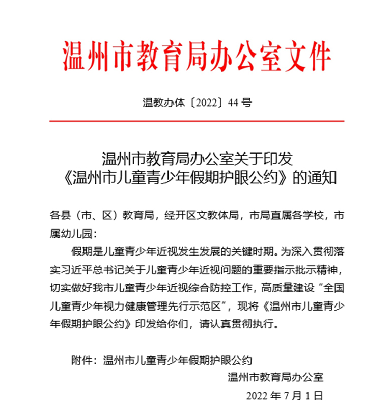 2022年7月1日,溫州市教育局發布《溫州市兒童青少年假期護眼公約》,強調假期是兒童青少年近視發展的關鍵時期,要求全市兒童青少年在暑假學習娛樂中,堅持愛眼、護眼,度過一個輕松、充實、有意義的假期。