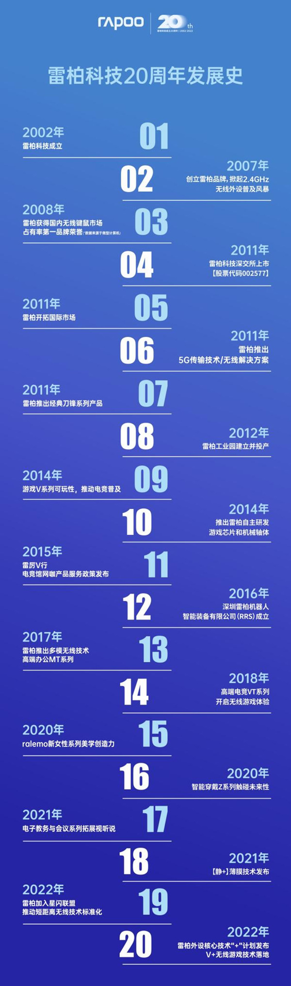 翻開雷柏科技的時間卷軸,從雷柏科技成立到雷柏品牌創立,從深交所上市、工業園投產到雷柏機器人升級3C智能制造,從2.4G無線外設普及、5G傳輸技術、自主研發游戲芯片及機械軸體到加入星閃聯盟、V+無線技術落地……變革的浪潮“無線技術”“無線生活”應運而生。