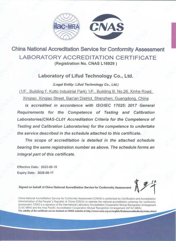 喜訊!!!萊福德取得CNAS實驗室認可證書