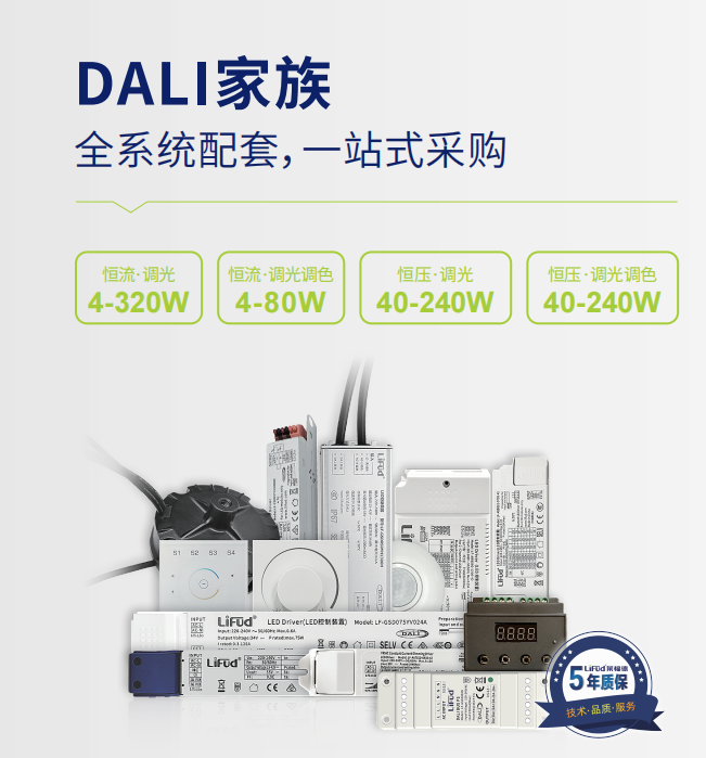 萊福德DALI家族擁有4-320W恒流&恒壓、調光&調光調色、隔離&非隔離各類驅動電源,并配備DALI主機、面板/旋鈕、總線電源、感應器、轉換器等一系列完整的DALI組件,可為市場提供DALI系統一站式采購服務!