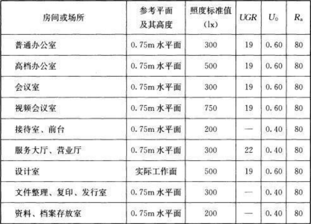 首先,還是老規(guī)矩,智能控制的基礎(chǔ)是先滿足標(biāo)準(zhǔn)規(guī)范,參照國家標(biāo)準(zhǔn)GB50034-2013《建筑照明設(shè)計標(biāo)準(zhǔn)》中對辦公建筑照明的要求,標(biāo)準(zhǔn)值如下: