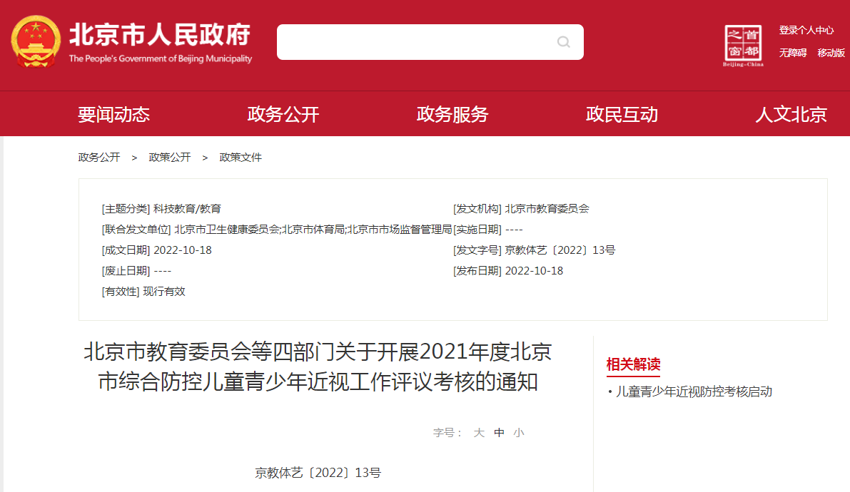 近日,北京市教育委員會、北京市衛生健康委員會、北京市體育局、北京市市場監督管理局四部門發布通知,將開展2021年度北京市綜合防控兒童青少年近視工作評議考核,重點考核強化學校體育和健康教育、降低近視率等指標,為各區近視防控整體推進情況打分,最終形成考核意見。