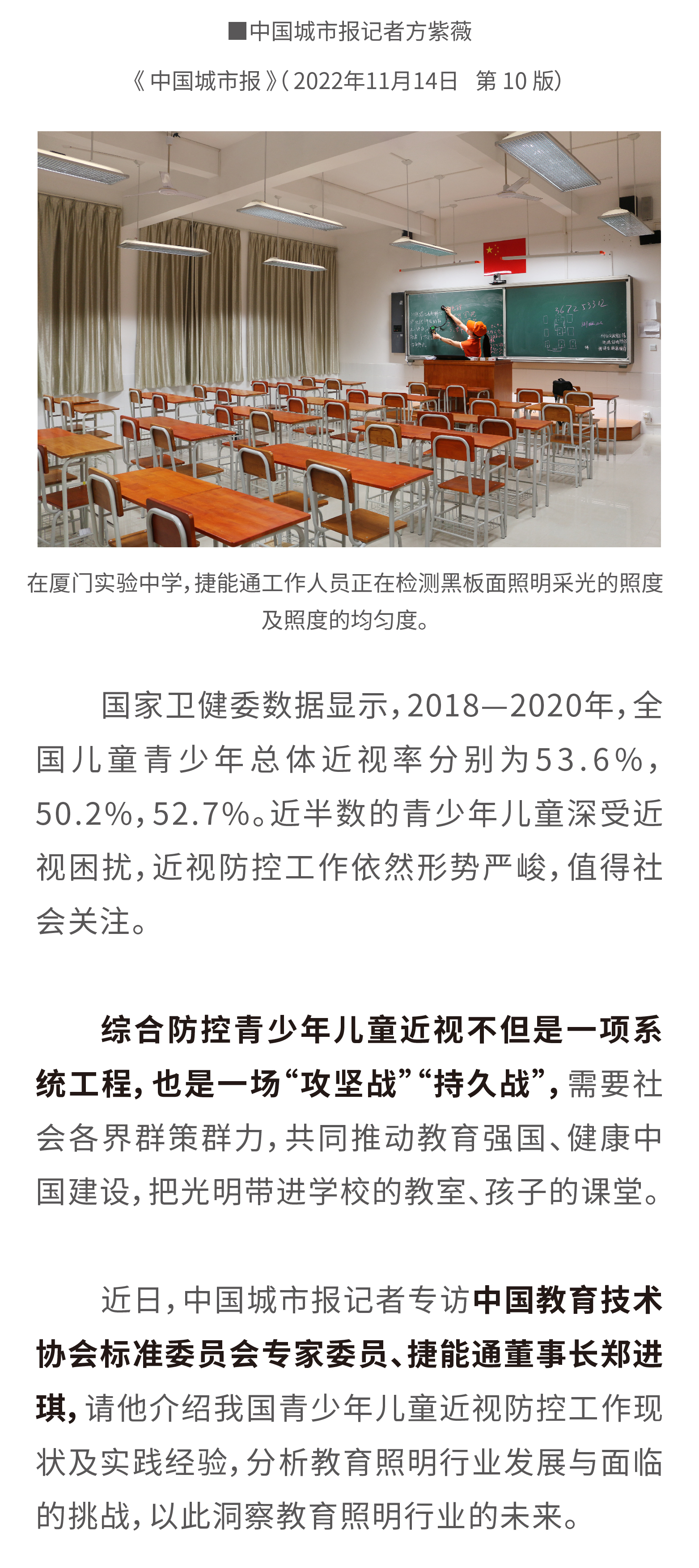教育照明行業(yè)蓬勃發(fā)展中國城市報(bào):近年來,國家非常重視兒童青少年近視防控工作,出臺了一系列近視防控政策,引發(fā)行業(yè)和社會(huì)的廣泛關(guān)注。對此,您的看法如何?