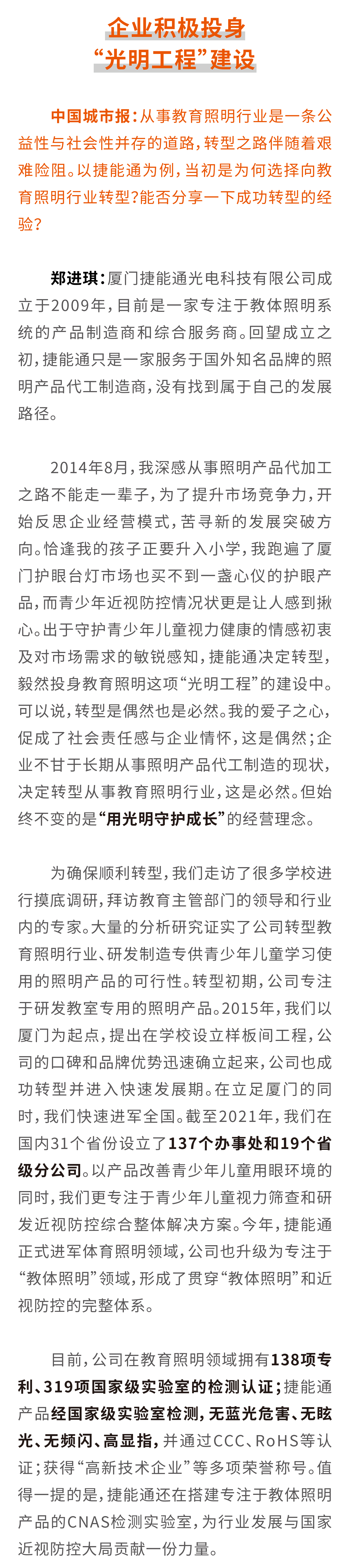 中國城市報(bào):近年來,隨著近視防控工作逐步得到社會(huì)重視,國內(nèi)教育照明行業(yè)呈現(xiàn)出蓬勃發(fā)展態(tài)勢。您認(rèn)為,當(dāng)前的教育照明行業(yè)存在哪些問題?應(yīng)該如何解決?鄭進(jìn)琪:近年來,我國教育照明行業(yè)的蓬勃發(fā)展,既得益于國家政策紅利,又得益于逐步提升的社會(huì)健康、環(huán)保意識等因素。由于一些地方一哄而上、盲目轉(zhuǎn)型教育照明行業(yè),缺乏標(biāo)準(zhǔn)化的執(zhí)行與監(jiān)督,從而產(chǎn)生行業(yè)亂象。為規(guī)范行業(yè)發(fā)展,國家頒布了一系列教室光環(huán)境檢測和驗(yàn)收的標(biāo)準(zhǔn)。例如GB7793—2010《中小學(xué)校教室采光和照明衛(wèi)生標(biāo)準(zhǔn)》、GB/T5700—2008《照明測量方法》、GB/T36876—2018《中小學(xué)校普通教室照明設(shè)計(jì)安裝衛(wèi)生要求》等。我認(rèn)為,只要保證招標(biāo)單位按國家標(biāo)準(zhǔn)進(jìn)行采購,供應(yīng)商按符合甚至優(yōu)于國家標(biāo)準(zhǔn)的要求來供貨,施工單位按國家標(biāo)準(zhǔn)來規(guī)范、安全施工,第三方檢測機(jī)構(gòu)按國家標(biāo)準(zhǔn)進(jìn)行驗(yàn)收,國家行政監(jiān)管單位按國家標(biāo)準(zhǔn)進(jìn)行監(jiān)管和檢查,就可以保證照明改造工程的安全性和可靠性。比如,很多招標(biāo)項(xiàng)目中提到質(zhì)保期6年,指的不僅僅是某一盞燈具產(chǎn)品的質(zhì)保,也是整體光環(huán)境,包括照度、照度均勻度、統(tǒng)一眩光值、藍(lán)光危害、閃爍等綜合指標(biāo)的質(zhì)保。只要研發(fā)企業(yè)、制造商、供應(yīng)商、施工單位等能夠嚴(yán)格執(zhí)行這些標(biāo)準(zhǔn)規(guī)范,就可以幫助這個(gè)行業(yè)走向規(guī)范與健康發(fā)展。
