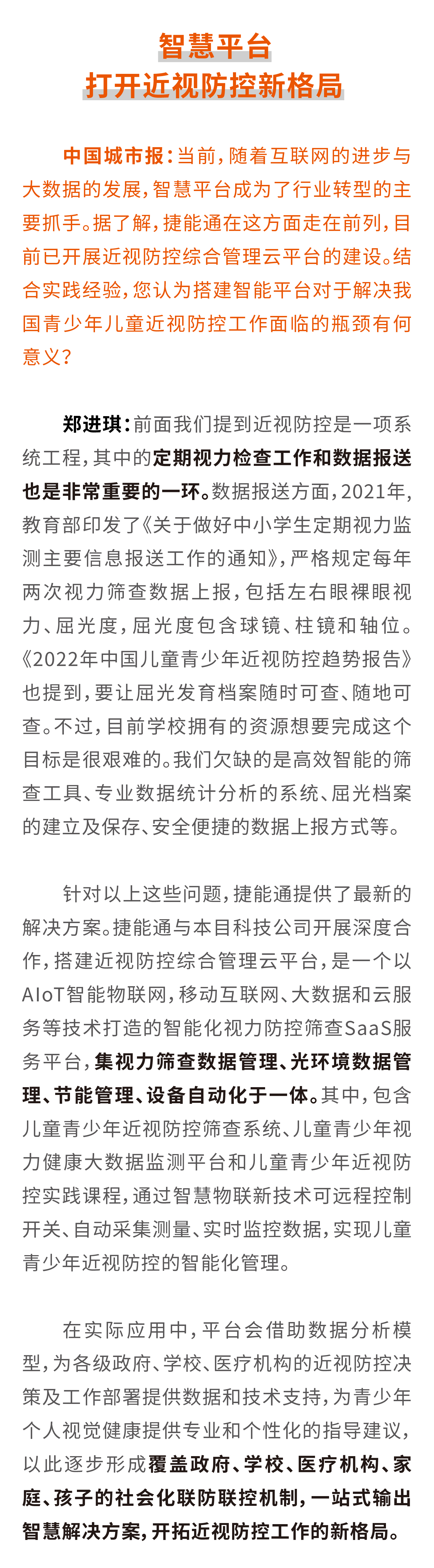 鄭進(jìn)琪:我國兒童青少年的近視率現(xiàn)狀讓人擔(dān)憂。加強(qiáng)兒童青少年近視防控,促進(jìn)兒童青少年視力健康,是國家關(guān)心、群眾關(guān)切、社會(huì)關(guān)注的“光明工程”。要解決兒童青少年近視問題,教室照明光環(huán)境的改造是關(guān)鍵的一步。現(xiàn)在,各級政府都將教室照明改造列入為民辦實(shí)事項(xiàng)目進(jìn)行全力支持。但是,影響兒童青少年視力健康的因素有很多,例如電子產(chǎn)品的使用時(shí)長、課桌椅的高度設(shè)置、學(xué)習(xí)時(shí)的光環(huán)境、進(jìn)行體育鍛煉的時(shí)長等。我們在調(diào)研中發(fā)現(xiàn),較注重體育課程的學(xué)校,其學(xué)生的近視率普遍較低。以小學(xué)階段為例,我們走訪過的小學(xué)體育類特色學(xué)校中,學(xué)生的近視率不超過10%。因此,近視防控是一項(xiàng)系統(tǒng)工程,需要政府、學(xué)校、家長、學(xué)生、醫(yī)療機(jī)構(gòu)等多方合作,共同建立社會(huì)化聯(lián)防聯(lián)控機(jī)制及網(wǎng)絡(luò)。