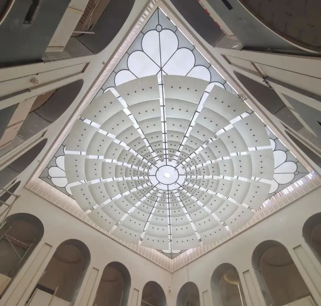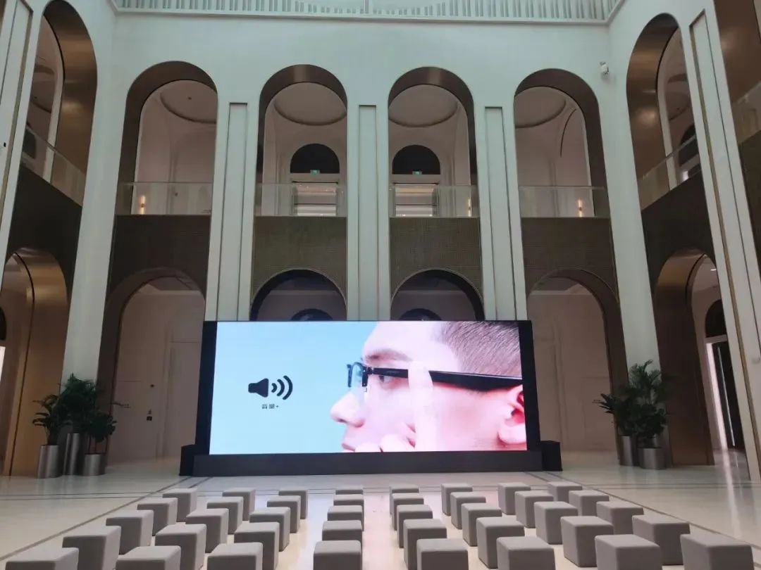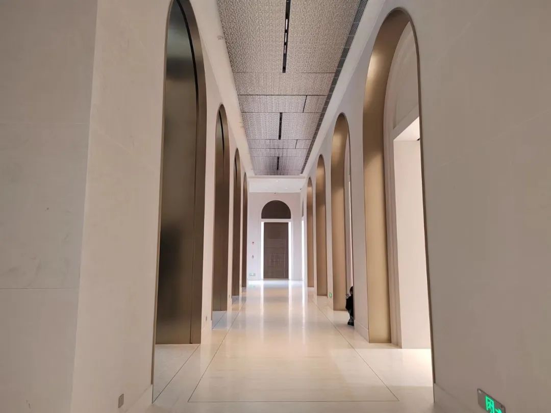 從活動大廳到產品展廳,長廊沿途圍繞,高聳的吊頂如宮殿華蓋,給予人宏偉的感受,卻又在點點星光、銀河般分布的燈光,色溫場景的變化中,營造出一種靈動與變化的科技感,讓人忍不住在建筑與燈光的交相輝映沉浸漫步。