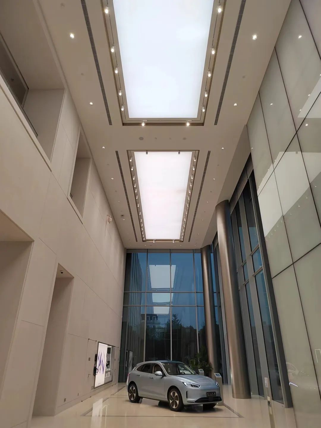 走進旗艦店,首先映入眼簾的就是華為車展空間,簡約的背景配合天花照明設計,讓或溫柔或清冷的燈光,在為不同風格車輛增光添彩的同時,通過開闊的落地窗戶,渲染出一種大氣寧靜而又奢華的感覺。
