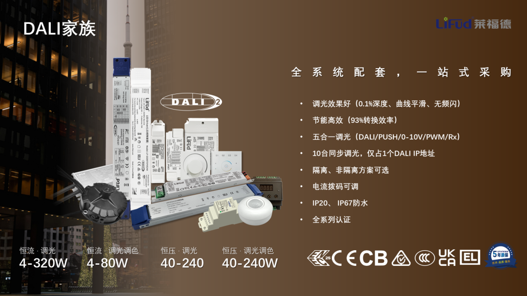 萊福德DALI調光電源,DALI2.0標準,可兼容市面所有標準DALI系統,如ABB、河東、施耐德、西門子、Helvar、路創、快思聰等主流控制系統,擁有10臺并機同步調光功能(1個IP帶10盞燈,減少主機,降低成本)、0.1%深度、健康無頻閃、高效節能等優異效果,助力各大項目燈光設計完美落地!