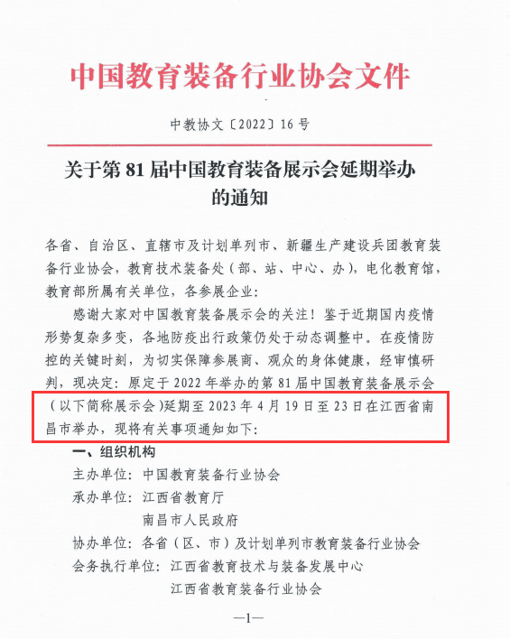 經審慎研判,中國教育裝備行業協會今日發布通知,將原定于2022年舉辦的第81屆中國教育裝備展示會,延期至2023年4月19—23日!舉辦地點仍為江西南昌。